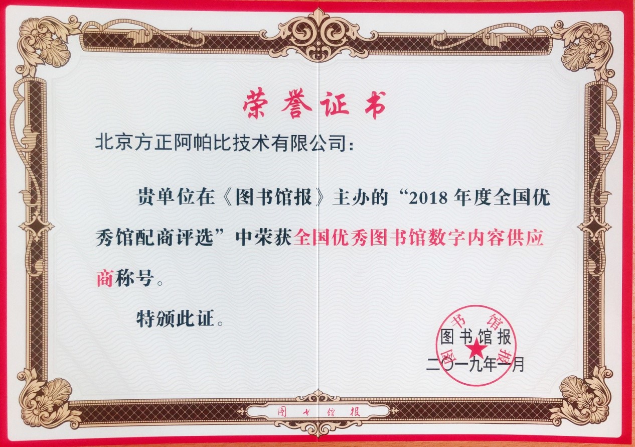 論壇期間進行了全國優(yōu)秀館配商頒獎典禮,這是館配行業(yè)共建共享的權(quán)威評選活動,也是業(yè)內(nèi)公認的評價館配企業(yè)的重要參考指標。在2018全國優(yōu)秀館配商評選活動中,北京方正阿帕比技術(shù)有限公司脫穎而出,獲得“2018全國優(yōu)秀圖書館數(shù)字內(nèi)容供應(yīng)商”殊榮。
