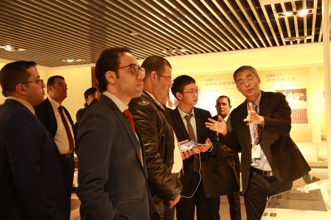 在北大方正信產(chǎn)集團(tuán)副總裁邵行的帶領(lǐng)下,埃及媒體團(tuán)參觀了位于方正大廈的王選紀(jì)念陳列室。邵行副總裁為大家介紹了由王選首創(chuàng)的“漢字激光照排系統(tǒng)”,使中國印刷業(yè)“告別鉛與火,迎來光和電”,從而展現(xiàn)我國漢字信息處理和印刷技術(shù)革命的光輝歷程。