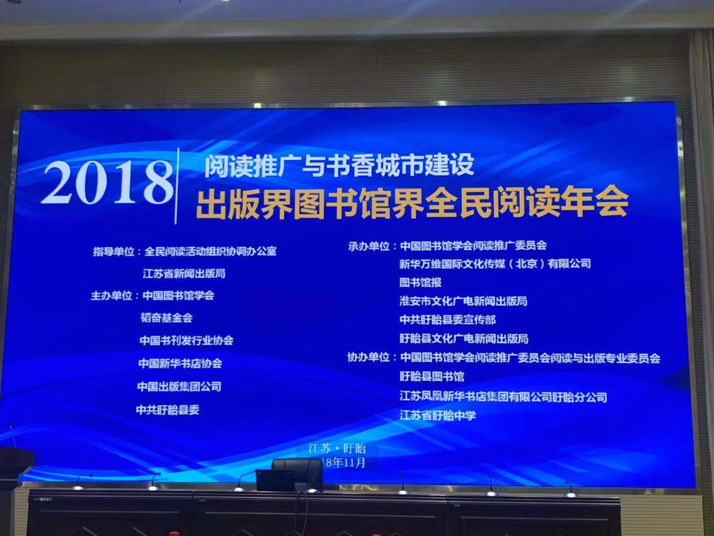 11月23日,由中國圖書館學(xué)會、韜奮基金會、中國書刊發(fā)行業(yè)協(xié)會、中國新華書店協(xié)會、中國出版集團(tuán)公司主辦的“2018出版界圖書館界全民閱讀年會”在江蘇盱眙舉辦。本屆年會以“閱讀推廣與書香城市建設(shè)”為主題,邀請出版界、發(fā)行界、圖書館界200余位嘉賓出席,為推進(jìn)全民閱讀建言獻(xiàn)策。