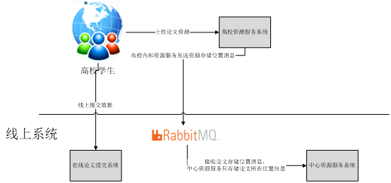 為了提高對高校使用論文提交系統(tǒng)的支持及快速響應(yīng),論文提交系統(tǒng)在線部署,高校對論文的提交、學(xué)校信息、學(xué)生信息等的管理使用線上服務(wù),可以做到有問題及時響應(yīng)。同時為了滿足高校對論文安全性的要求,本系統(tǒng)中將資源存儲從線上服務(wù)獨立出來形成了資源服務(wù)系統(tǒng),部署在高校。學(xué)生上傳的論文資源直接存儲在高校部署的資源服務(wù)系統(tǒng)中,從而達(dá)到在線提供優(yōu)質(zhì)服務(wù),線下提供資源管理服務(wù)提升論文安全性。