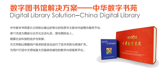 中華數(shù)字書苑是方正阿帕比推出的專業(yè)優(yōu)質(zhì)華文數(shù)字內(nèi)容整合服務(wù)平臺,收錄了建國以來大部分的圖書全文資源、全國各級各類報紙及年鑒、工具書、圖片等特色資源產(chǎn)品,旨在為圖書館、學校、企業(yè)、政府等客戶及其所屬讀者提供在線閱讀、全文檢索、離線借閱、移動閱讀、下載、打印等數(shù)字內(nèi)容和知識服務(wù)。